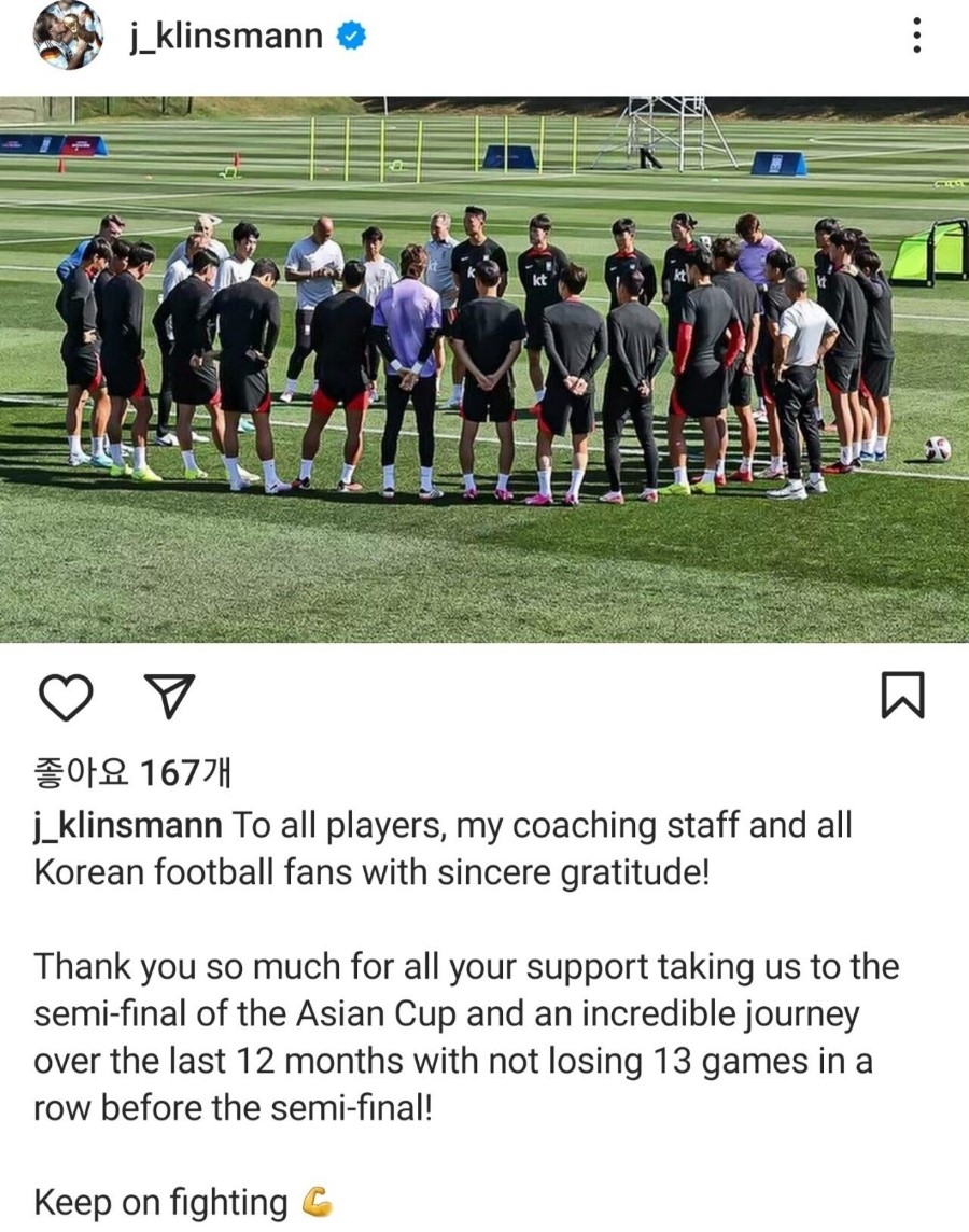 클린스만 감독은 이에 앞서 경질 통보를 예상이라도 한듯 인스타그램을 통해 작별 인사를 암시하는 듯한 글을 남겨 관심을 모았습니다. "모든 선수와 코치진, 모든 한국 축구 팬분들께 진심으로 감사하다. AFC 아시안컵 준결승까지 갈 수 있도록 응원해 주셔서 고맙다. 준결증전까지 지난 12개월 동안 13경기 무패 행진과 함께 놀라운 여정이었다"라며 감사의 인사와 한국 축구의 앞날을 응원했습니다.